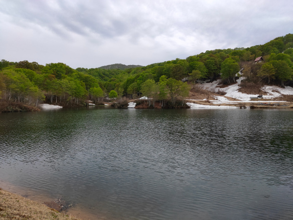 水と新緑と雪がいいコントラストです。