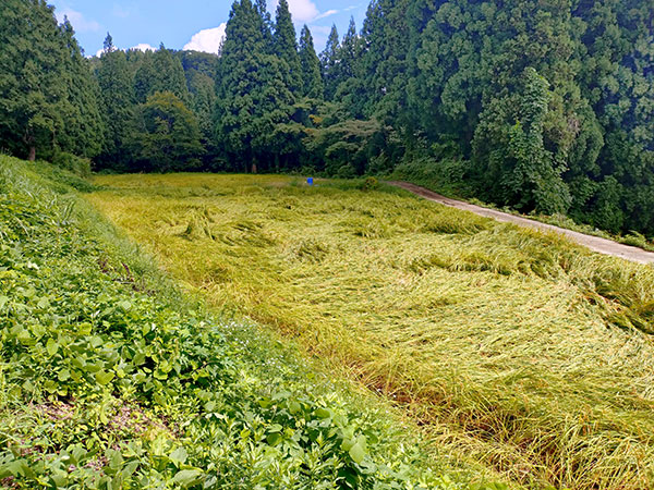 強い雨で倒伏している田んぼも。