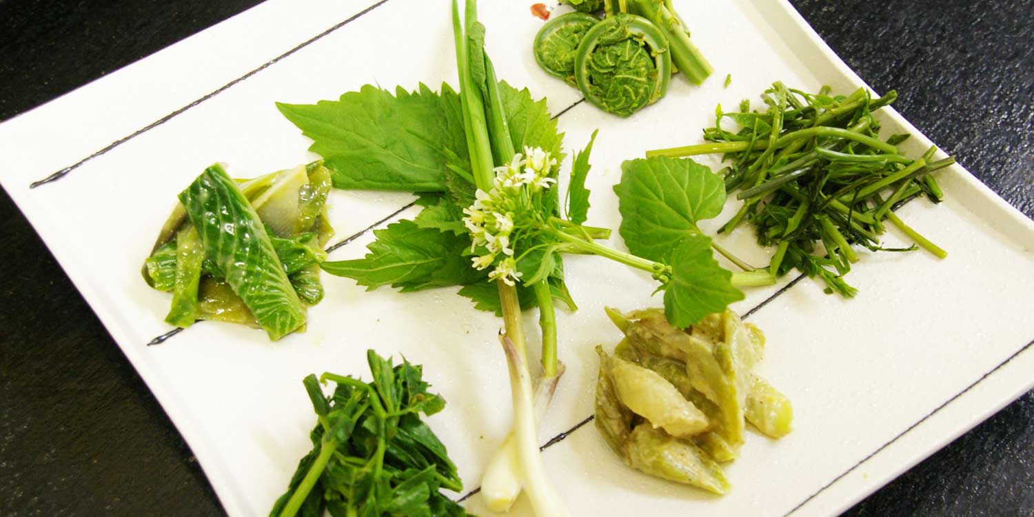 松之山は世界有数の豪雪地です。雪の恩恵を受けた山菜や地野菜などの山の幸や雪国の伝統食が楽しめます。魚沼産コシヒカリの棚田米は契約農家より直接買い付けています。