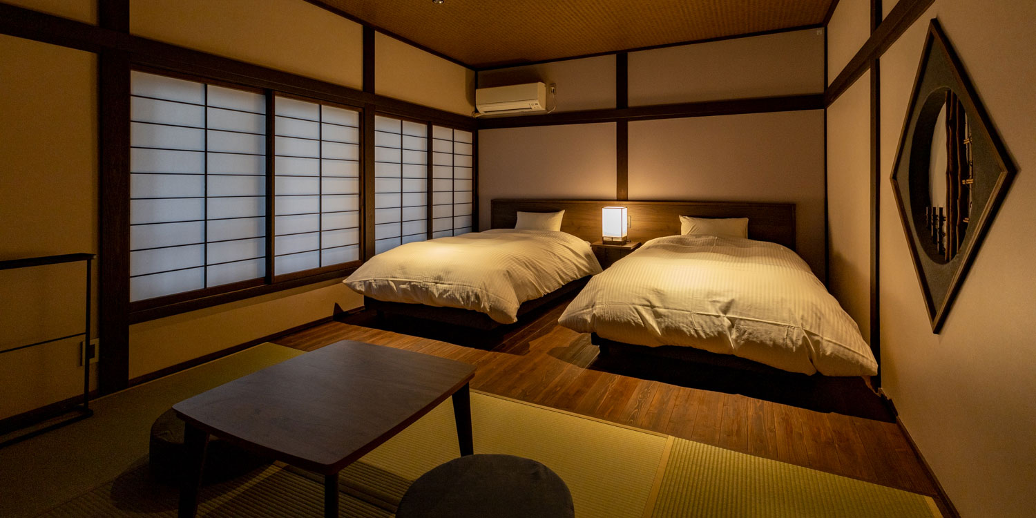 昔ながらの木造旅館です。2020年全客室をリニューアルし、すべてベッドのあるお部屋になりました。スタッフがお部屋にお邪魔することはありませんのでプライベート空間で旅をお楽しみください。Wi-Fiもご利用いただけます。