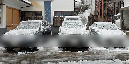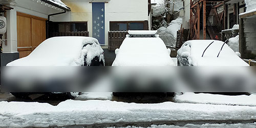 当館の駐車場は屋根がありませんので雪が積もります。基本的にお車の管理はお客様にお任せしておりますが、できる限りお車の雪下ろしと周りの除雪をいたします。一般的なスノーブラシを使用します。お車を傷つけるといけませんので、ある程度大まかに雪下ろしをいたします。10cmほどの積雪の場合は写真のような感じになります。隣接して駐車したお車の関係上、特にお申し出のない場合には除雪をいたします。お車に触れてほしくない場合はチェックインの際にお申し出くださいませ。