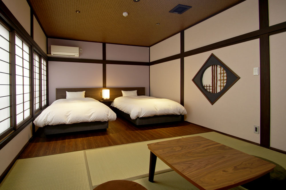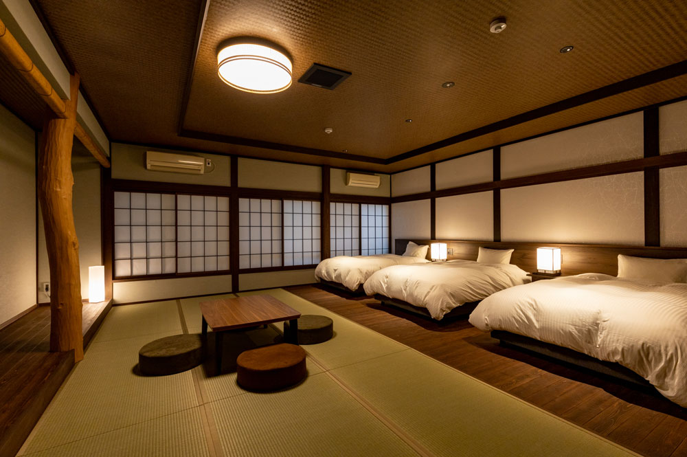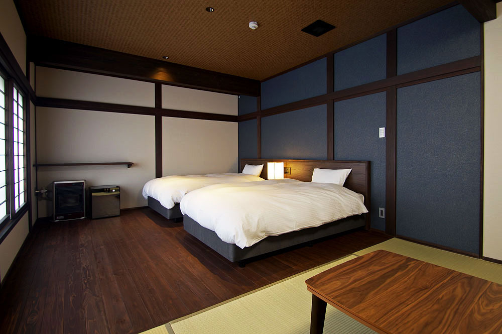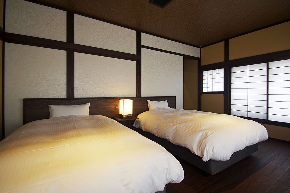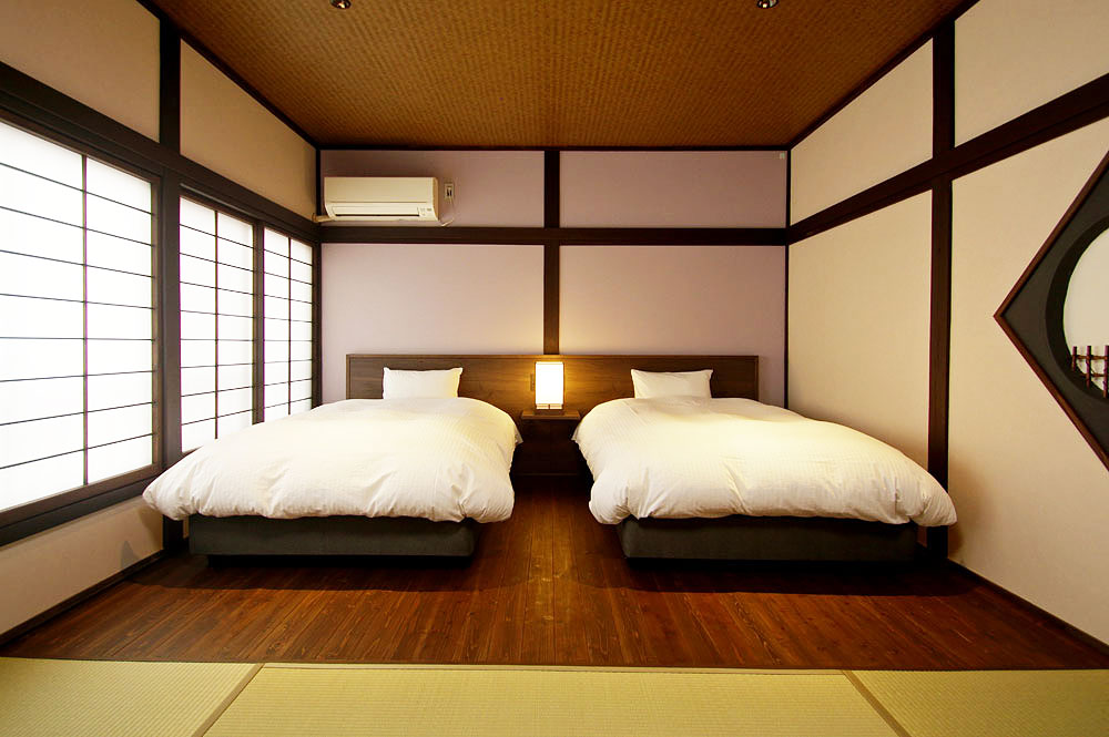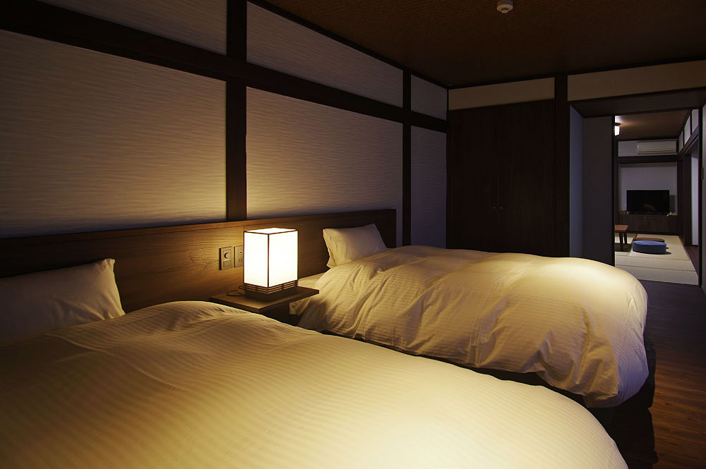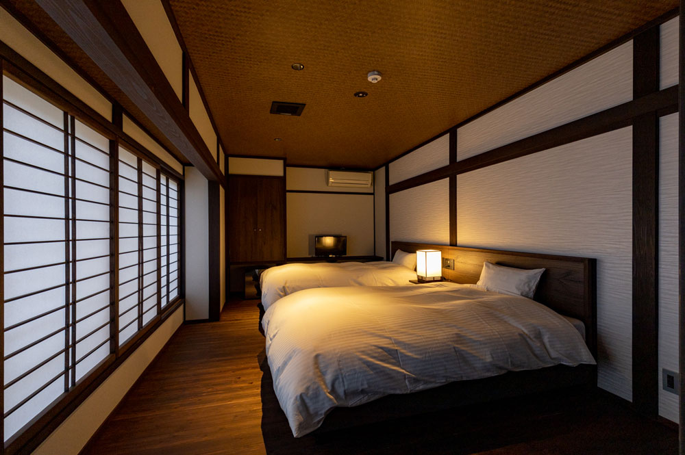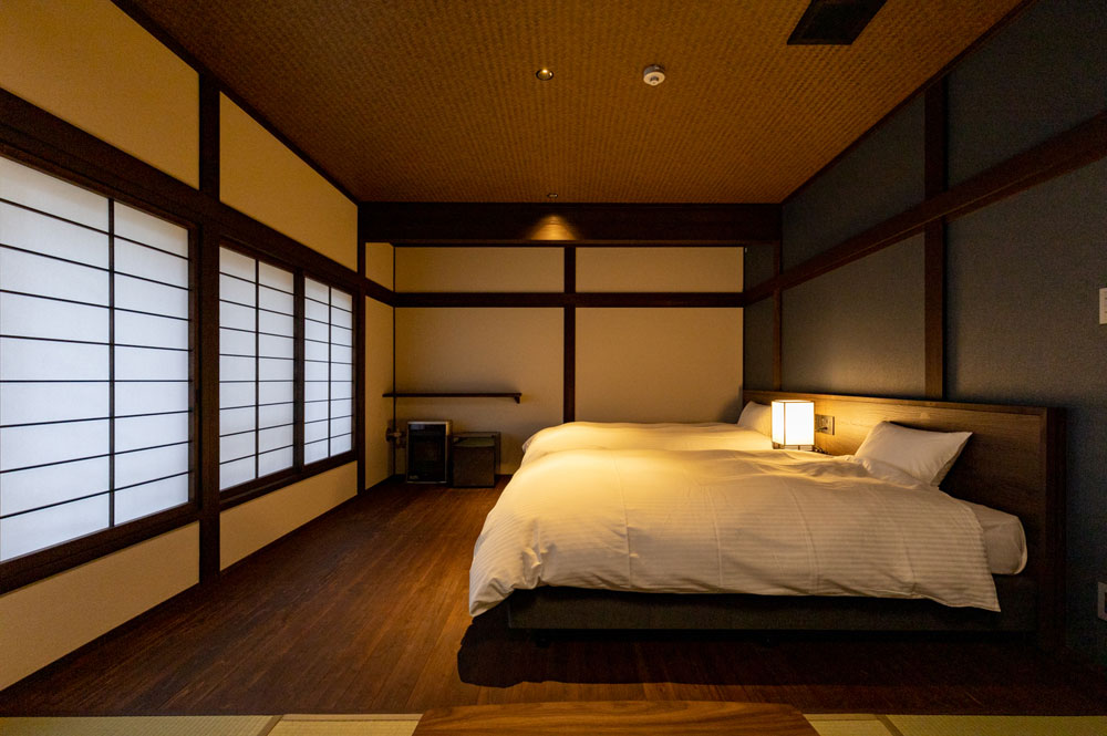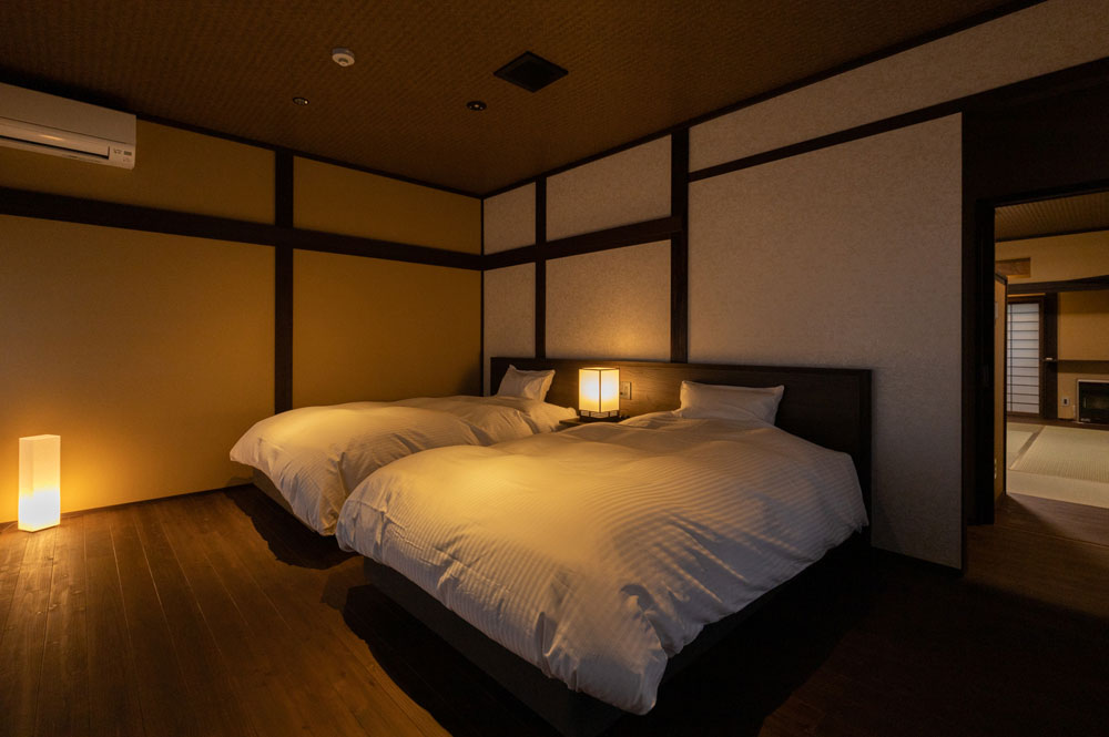 当館のお部屋はわずか5室。すべてのお部屋にシモンズ製セミダブルのベッドがあります。お風呂上りにゴロリと横になれるように畳のスペースもしっかりと確保した和洋室、少し贅沢な2間続きのお部屋などそれぞれ設えの違う5室となっています。スタッフは一切お部屋にお邪魔いたしませんので、お客様だけの完全プライベート空間でごゆっくりとお寛ぎくださいませ。