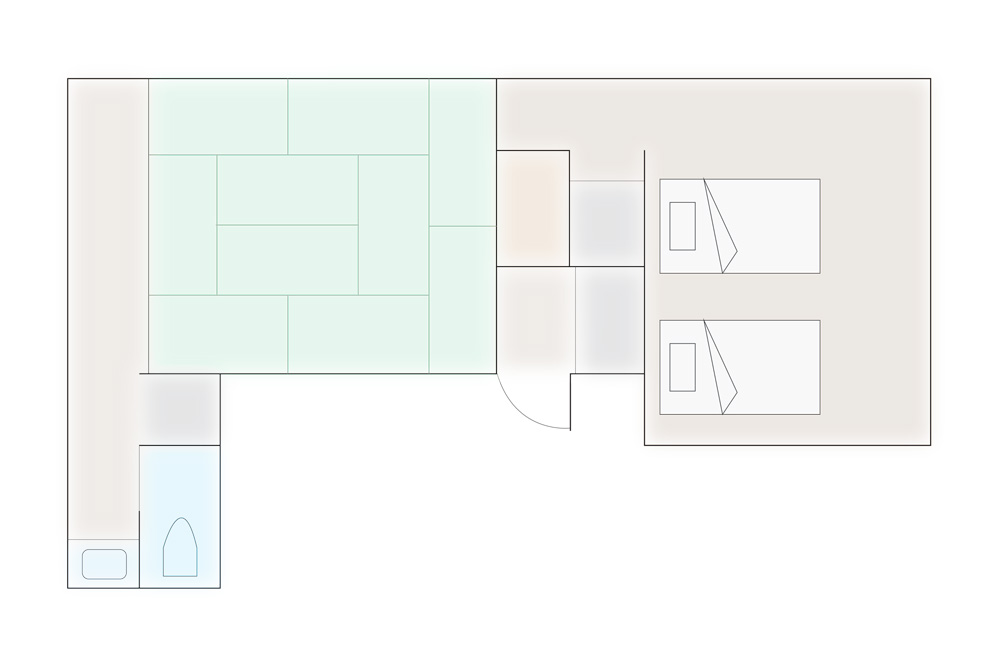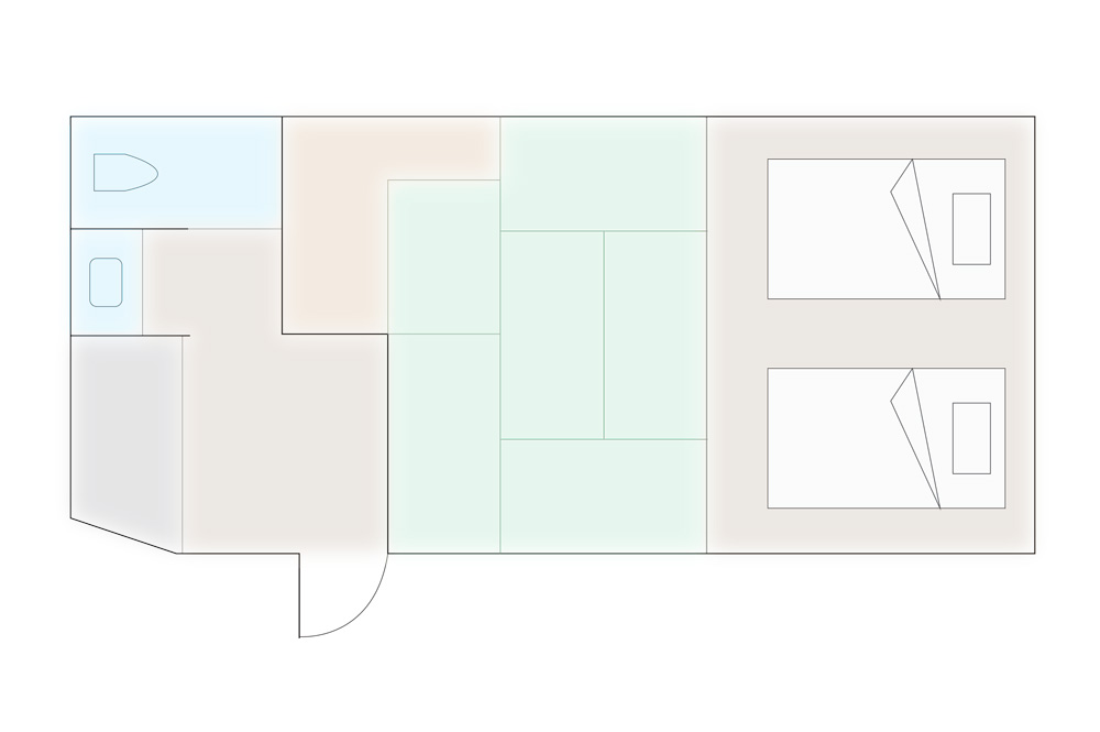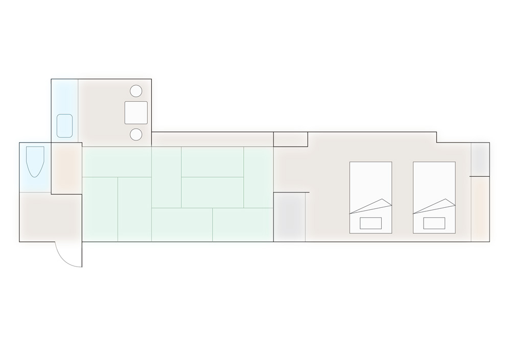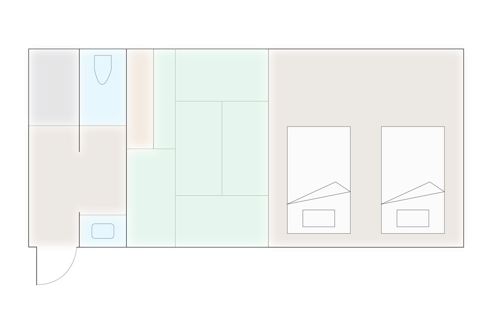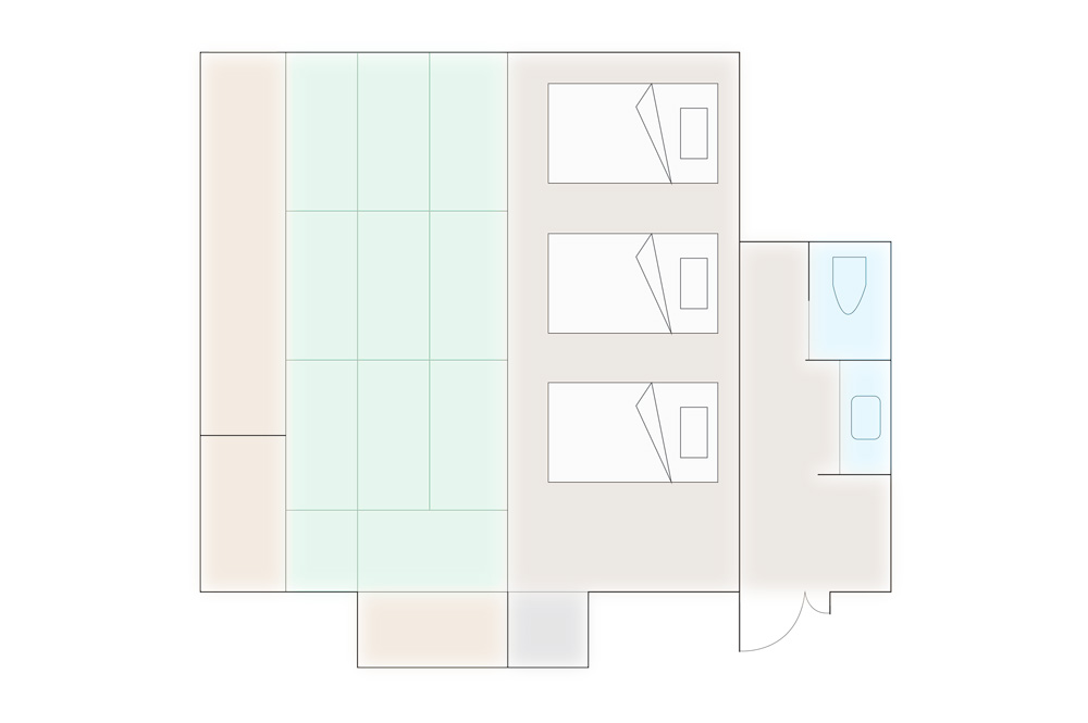 ブナ林、棚田や高原…日本の原風景と言われる里山ではとにかくゆったりとした時が流れます。耳をすませば風で揺れる草木や野鳥のさえずり、川の流れのなど自然音。静かで穏やかで癒しの世界です。淡い緑を基調としブナの芽を思わせる大胆なアクセントを。唯一のトリプルルームです。